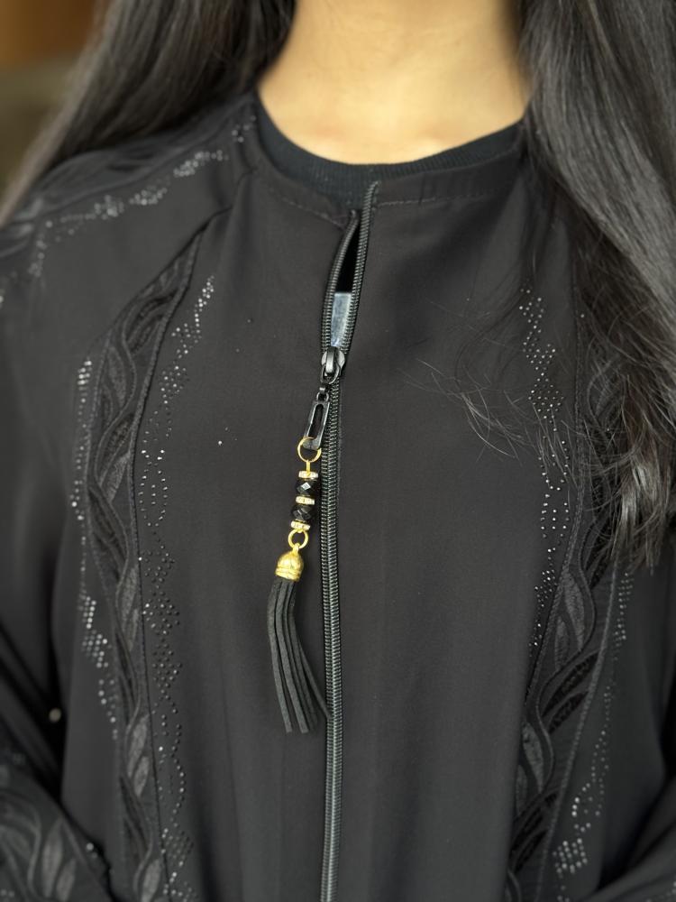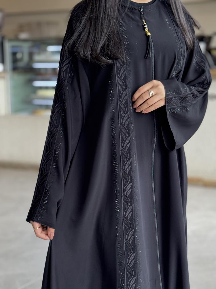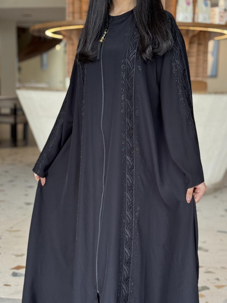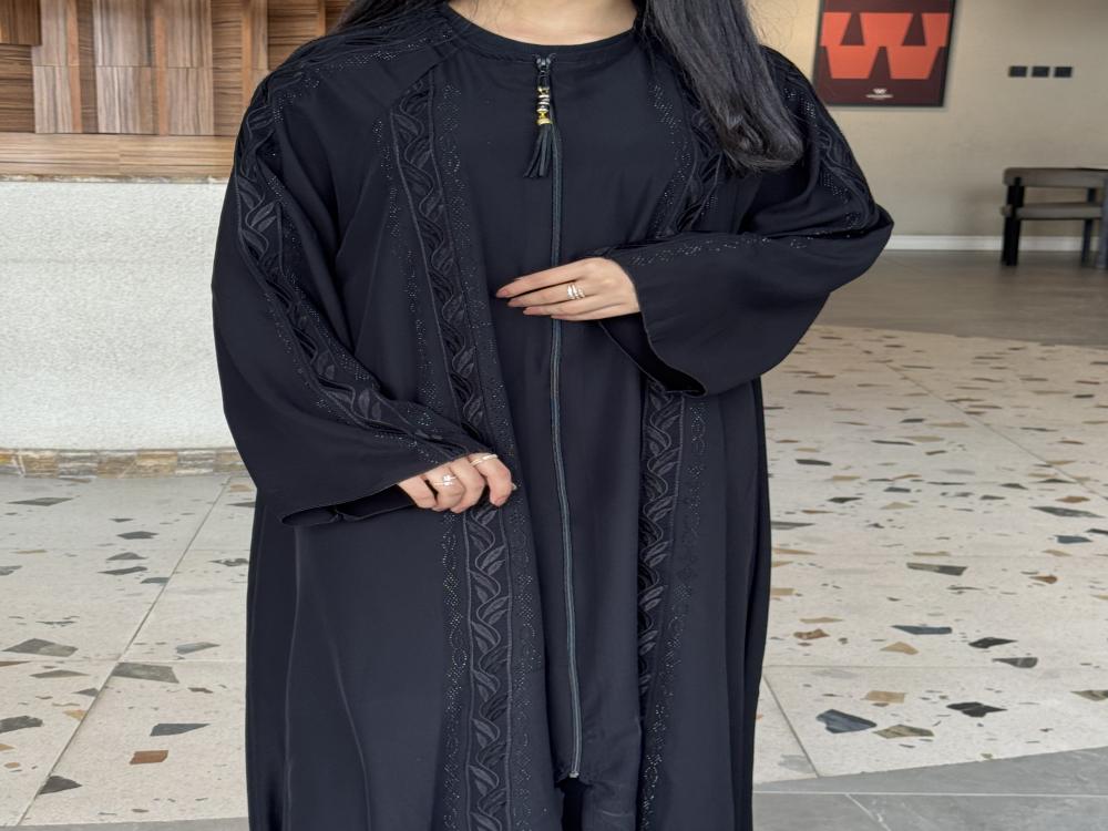 "عباية بفصوص في طول الموديل تمتد من الكتف إلى الأكمام"